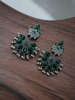 Add a touch of elegance and cultural charm to your jewelry collection with our Oxidised Peacock Stud Stone Earrings. Designed to emulate traditional Indian artistry, these earrings are a true masterpiece, blending intricate detailing with a sophisticated oxidized silver finish. Inspired by the graceful allure of the peacock, a symbol of beauty and pride, these stud earrings exude both timeless elegance and contemporary style, making them a perfect accessory for various occasions.
