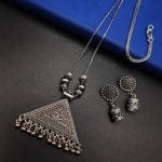 Designed for those who appreciate the fusion of tradition and style, the Oxidized Triangle Chain Necklace with Jhumka Earrings is a testament to timeless beauty. Embrace the allure of cultural craftsmanship and make a statement that resonates with elegance and individuality.