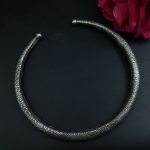 Crafted using premium German silver, the necklace showcases a finely detailed oxidized finish that enhances its antique appeal. The structured design reflects traditional Indian craftsmanship, commonly worn in various regions for weddings, festivals, and special occasions. Whether paired with a saree, kurti, or lehenga, this Hasli necklace is designed to elevate your ethnic look effortlessly.