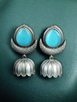 Made from high-quality base metal, these earrings are coated with a premium oxidized silver replica finish that gives them an antique and royal appearance. The intricate jhumka design is inspired by traditional Indian motifs, while the Monalisa stone adds a subtle glow and refined elegance to the overall look. Each stone is carefully set to ensure durability and balanced beauty, making these Oxidized a true statement accessory.