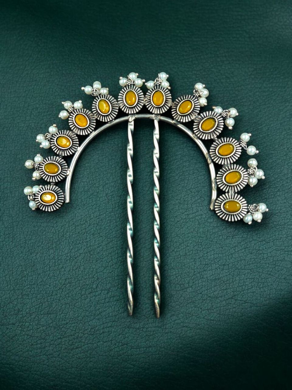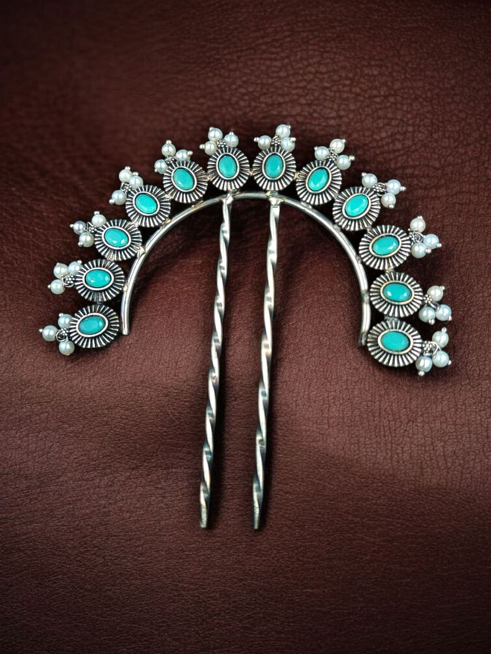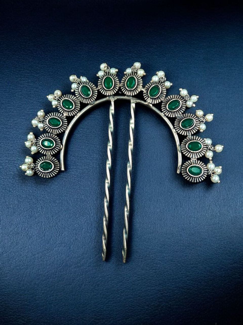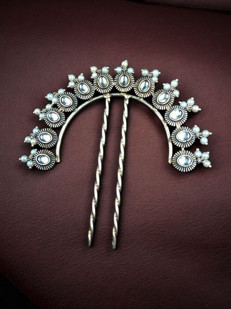 Elevate your traditional hairstyles with our Traditional Oxidized Juda Pin | Pearl & Stone Silver Replica Hair Accessory Jewelry, a beautifully handcrafted piece designed to add elegance, charm, and cultural richness to your look. This stunning juda pin blends artistry with functionality, making it an essential accessory for women who love enhancing their buns and updos with classic ethnic jewelry.
