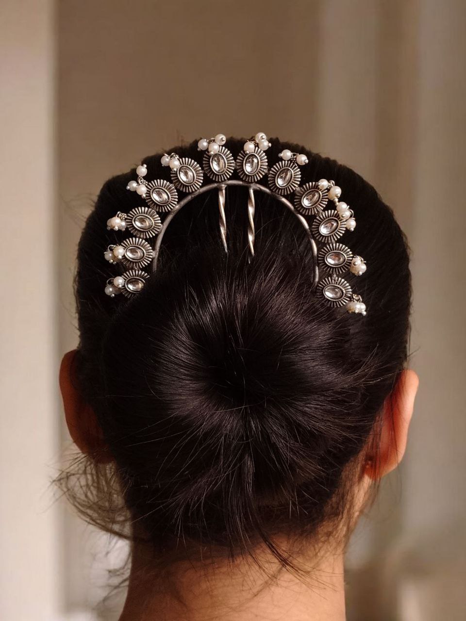 Crafted with premium silver replica plating, the juda pin features an intricate oxidized finish that gives it a timeless antique appeal. The delicate combination of pearls and sparkling stones adds a touch of sophistication while maintaining the traditional essence. Each element is carefully placed by skilled artisans, ensuring a balanced, graceful, and eye-catching design that enhances any hairstyle instantly.