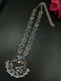 Designed to complement a wide range of outfits, this silver replica oxidized necklace pairs beautifully with sarees, kurtis, lehengas, and Indo-western attire. Whether you are attending a festive celebration, wedding function, cultural event, or casual gathering, it adds elegance and completes your look with ease. Its versatile style allows it to be worn alone as a statement piece or layered with other necklaces for a more contemporary appearance.