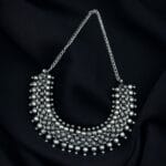 This stunning choker features a silver-plated oxidized finish, giving it a vintage-inspired look with a touch of contemporary style. The fine craftsmanship is evident in the delicate motifs and traditional patterns, making it a timeless piece. The oxidized silver hue beautifully complements both bright and subtle outfit colors, making it an ideal accessory for cultural events, weddings, and festive celebrations.