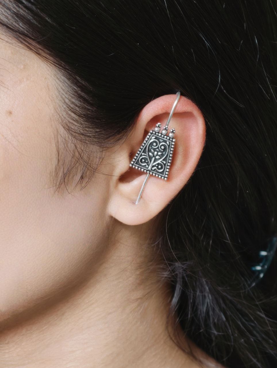 This Floral Art Earcuff pairs effortlessly with sarees, kurtis, ethnic dresses, and fusion outfits. Whether you are styling a traditional look or adding a cultural touch to a casual outfit, this earcuff enhances your appearance with subtle sophistication. The oxidized silver tone complements both bright festive colors and soft everyday shades, making it a versatile accessory for different wardrobes.