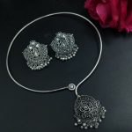 Grace your neckline with timeless elegance through this Oxidized Silver Plated Hasli Necklace Set, complete with exquisitely designed matching earrings. A perfect blend of traditional charm and modern craftsmanship, this jewelry set is adorned with intricate detailing and subtle pearl work, making it a stunning choice for ethnic and festive occasions.