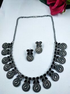 The choker features a beautifully carved peacock motif at its center, symbolizing beauty, pride, and divine creativity. Each element is carefully handcrafted to give a silver replica finish, offering the look and feel of premium silver jewelry at an affordable price point. The embedded stones enhance its appeal, reflecting sparkling hues that catch the light effortlessly and add a royal radiance to your neckline.