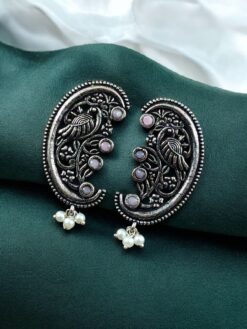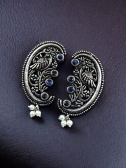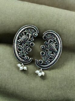 The earrings feature a beautifully detailed peacock motif, a symbol of grace, prosperity, and divine beauty in Indian tradition. The peacock design is enhanced with intricate floral art patterns, giving the earrings depth and artistic charm. Carefully set stones add a subtle sparkle, while delicate pearl detailing brings softness and elegance to the overall design. The oxidized finish highlights every curve and detail, offering a rich antique look that closely resembles handcrafted silver jewelry.