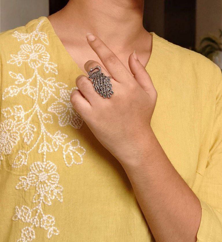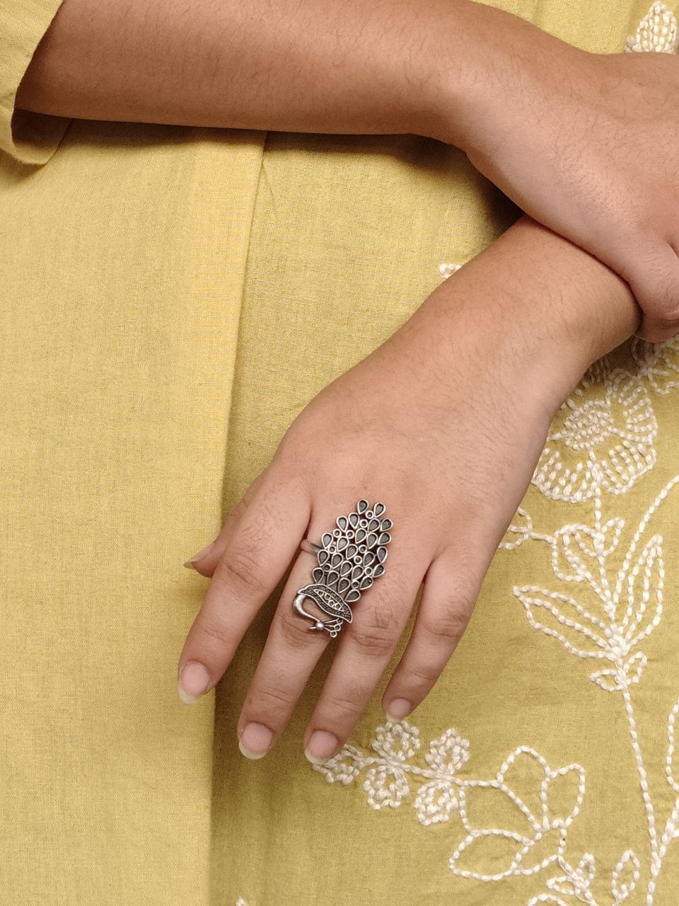 This peacock design ring pairs beautifully with traditional outfits like sarees, kurtis, salwar suits, and lehengas, as well as indo-western and boho-inspired clothing. Its oxidized finish blends seamlessly with both simple and grand looks, adding just the right amount of ethnic charm.