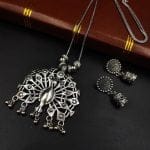 Introducing our Oxidised German Silver Chain Peacock Necklace Set with Jhumka Earrings, a perfect blend of elegance and traditional charm. This stunning Oxidised Chain Pendent jewelry set is designed to enhance your beauty and add a touch of sophistication to any ensemble.