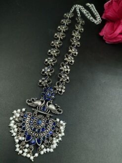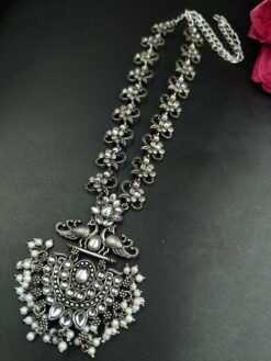 The necklace is beautifully oxidized to give it an antique finish, while the silver plating adds durability and shine. The combination of colorful stones with elegant pearl work elevates its overall charm, giving it a regal and ethnic touch. This piece is not just jewelry but an expression of artistry, designed for women who love to embrace traditional elegance with a contemporary twist.
