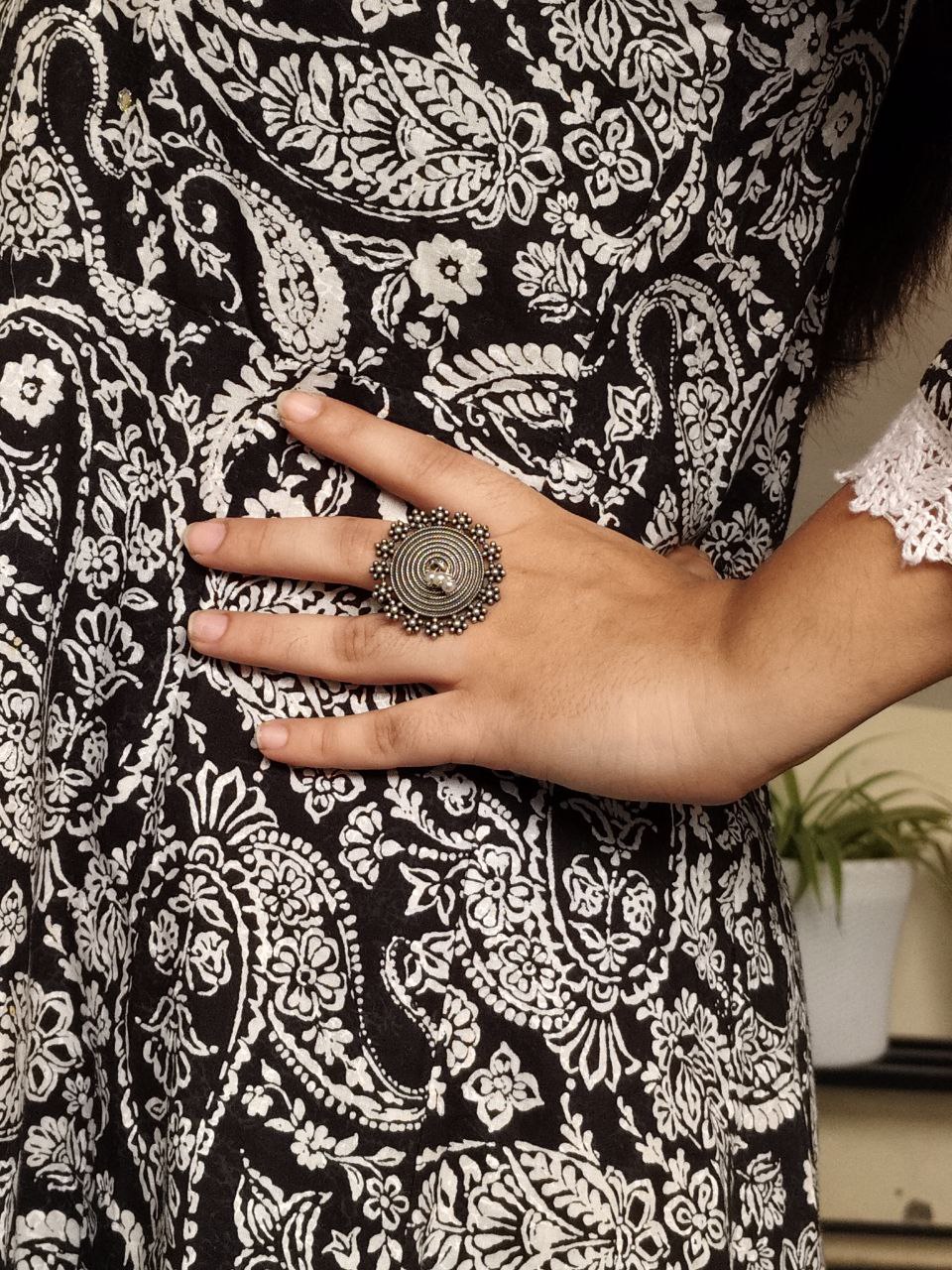 The ring showcases a beautifully handcrafted design, with every curve and motif carefully shaped by skilled artisans. The premium oxidized surface enhances the traditional look, while the luminous pearl adds a soft, graceful touch that instantly elevates your overall style. Whether you prefer traditional outfits like kurtis and sarees or modern ensembles like dresses and tops, this ring blends seamlessly with every look.