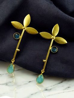 The defining feature of these gold-plated brass earrings is the exquisite Monalisa stone, carefully selected for its unique color and brilliance. The stone adds a captivating sparkle that elevates the entire design, making these studs ideal for dressing up a casual outfit or complementing formal attire. Its contemporary shape and long silhouette create a modern aesthetic that is both bold and graceful.