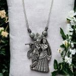 Indulge in the divine charm of Radha Krishna Pendant Necklace with our exquisite Jewelry crafted in elegant German silver, exuding timeless beauty and spiritual significance. This intricately designed piece of oxidized jewelry is more than just an accessory; it’s a reflection of devotion and artistry.