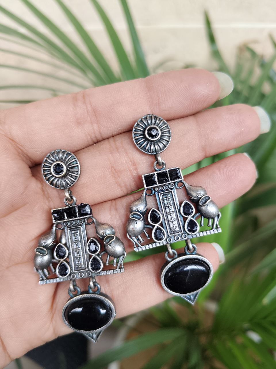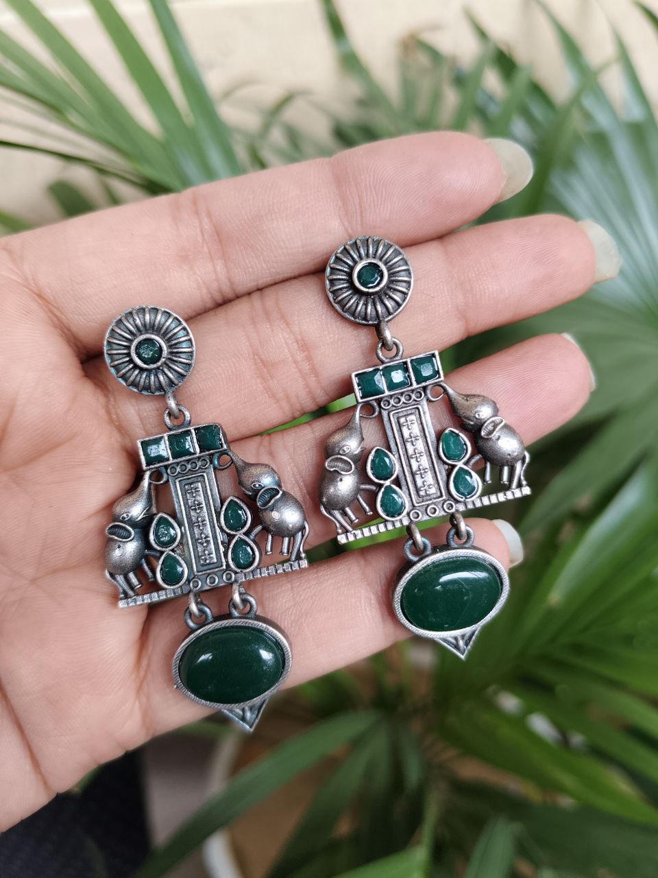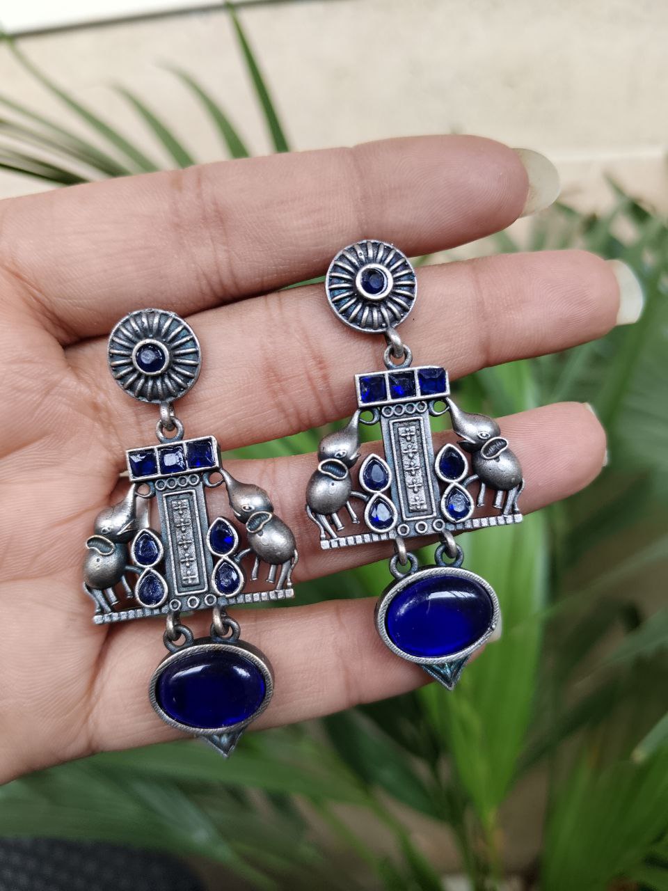 Crafted from high-quality brass and finished with a premium silver polish, these earrings offer durability along with a refined antique look. The intricate elephant detailing showcases fine craftsmanship, making each piece visually appealing and rich in character. Despite their detailed design, they are lightweight and comfortable, allowing you to wear them for long hours without any discomfort.