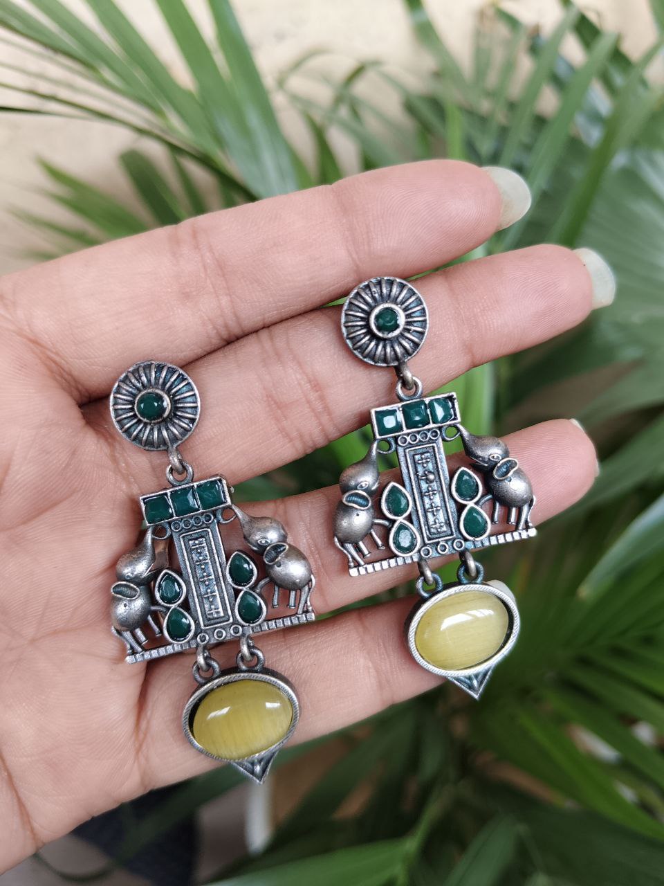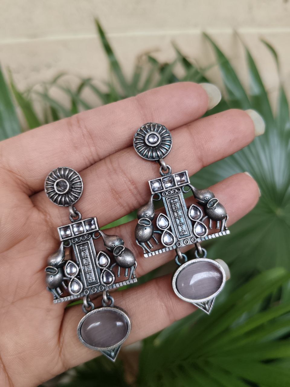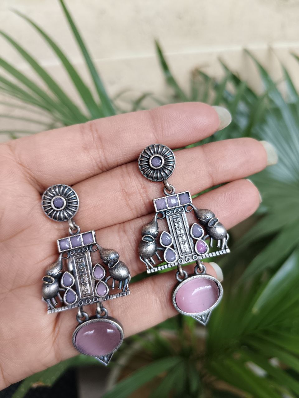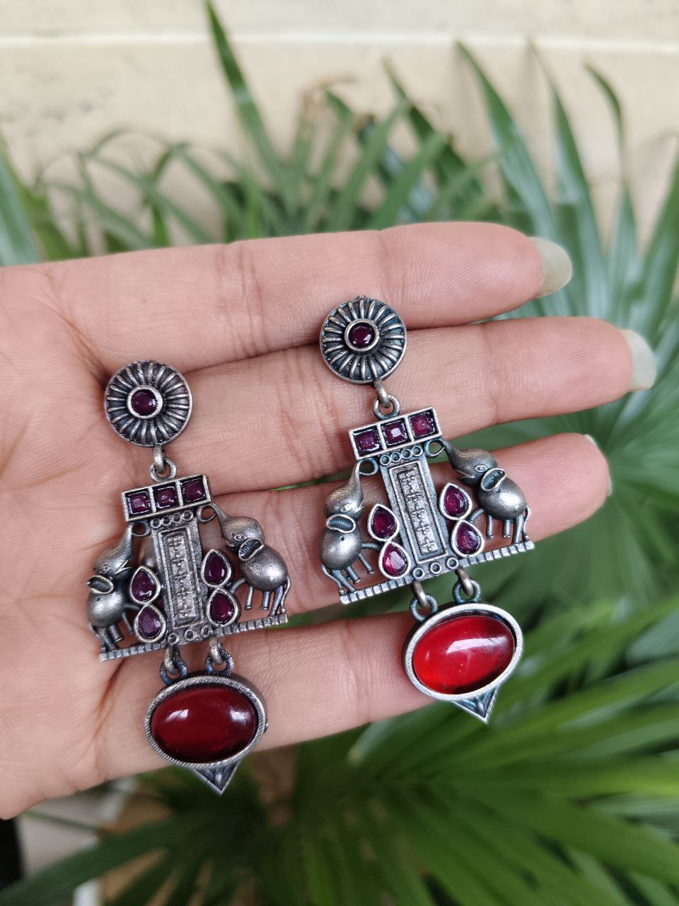 Crafted from high-quality brass and finished with a premium silver polish, these earrings offer durability along with a refined antique look. The intricate elephant detailing showcases fine craftsmanship, making each piece visually appealing and rich in character. Despite their detailed design, they are lightweight and comfortable, allowing you to wear them for long hours without any discomfort.