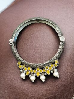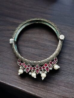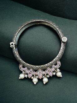 Crafted with a premium silver look alike finish, this bangle closely resembles real silver jewelry, giving it a rich and authentic appearance. The intricate stone and pearl detailing adds grace and sophistication, making the bangle a perfect blend of elegance and traditional charm. Each stone is carefully placed to enhance the overall design, while the pearl accents bring a soft, refined touch.