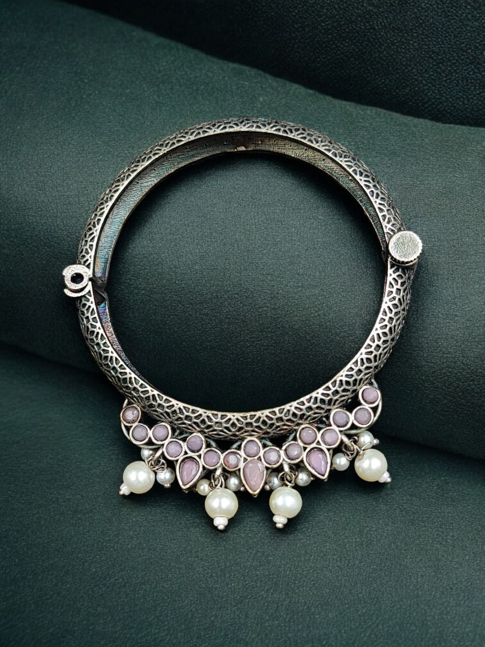 Enhance your ethnic jewelry collection with this Traditional Silver Look Alike Openable Bangle, beautifully designed with elegant stone and pearl work. Inspired by classic Indian craftsmanship, this kada-style bangle reflects timeless tradition while offering modern comfort and convenience through its openable design.