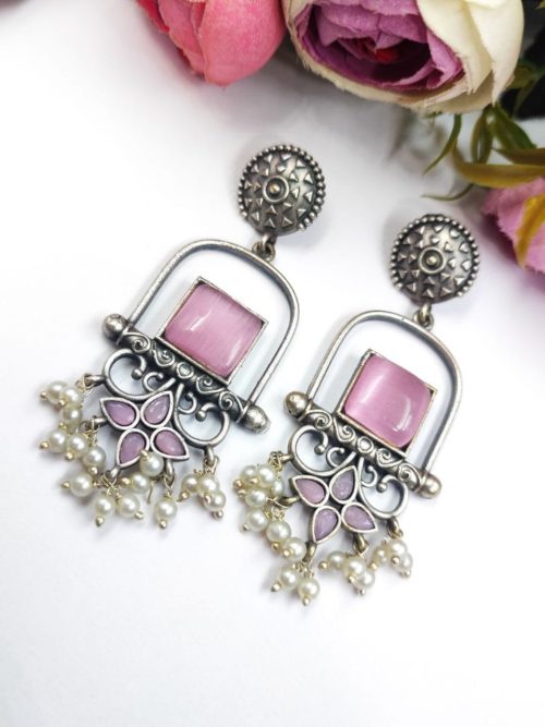 Silver Replica Earrings with Monalisa Stone & Adorable Pearl Work