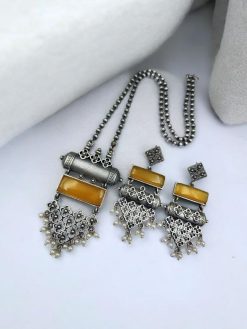 Indulge in the timeless allure of vintage-inspired elegance with our Antique Touch Silver Look Necklace Set, featuring an exquisite Oxidized Monalisa Stone Chain Pendant. This necklace set is a beautiful blend of traditional craftsmanship and modern design, making it a perfect accessory for both casual and special occasions.