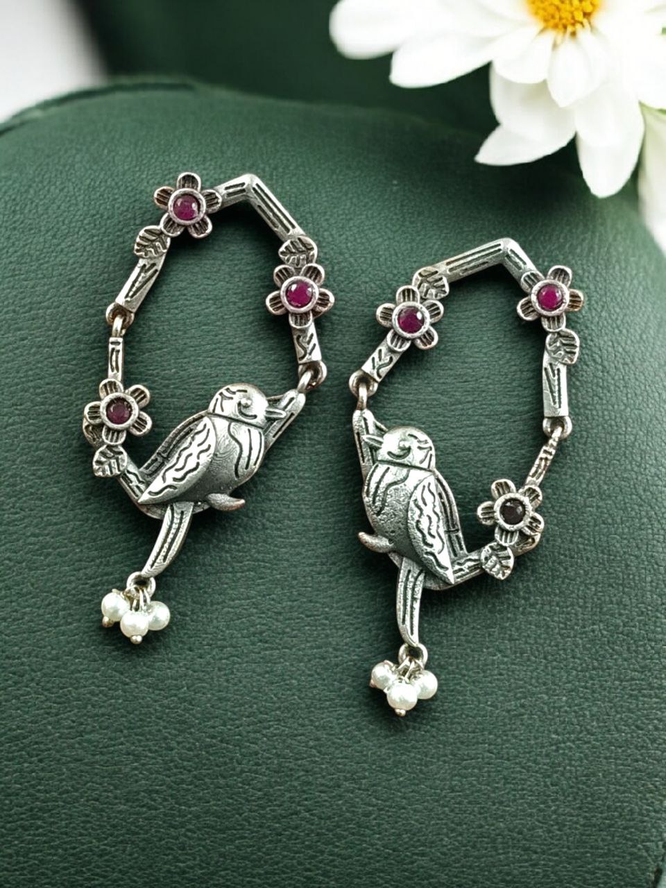 Traditional Silver Replica Parrot Design Dangler Earrings | Stone & Pearl Work Best Oxidized Jewelry