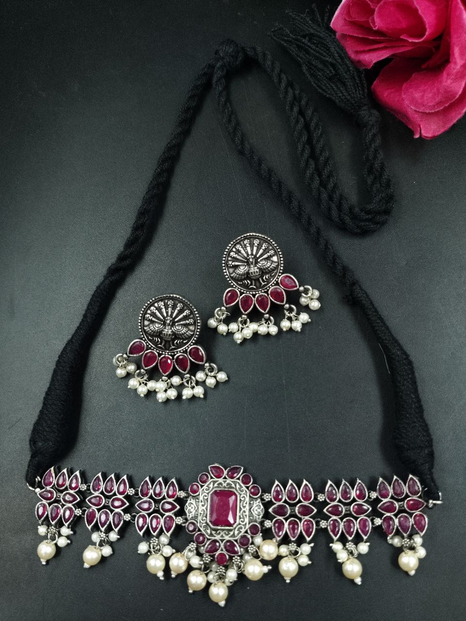 Flower Charm Oxidized German Silver Chain Necklace Set for Women Traditional Ethnic Jewelry