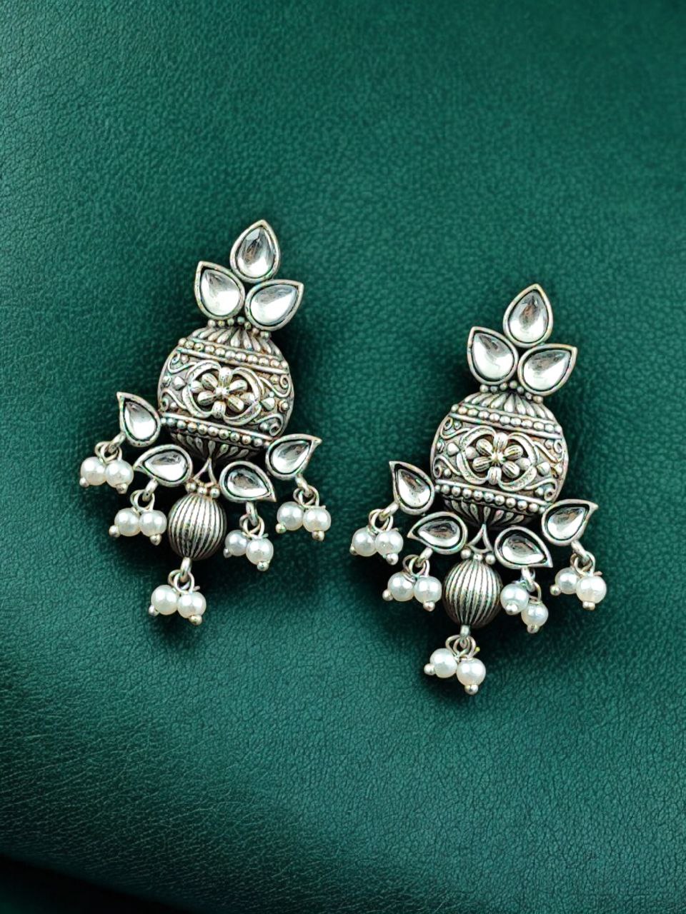 The beauty of these Silver Replica Kalash Earrings lies in their versatility. Their classic design and neutral silver tones make them an ideal accessory for a variety of occasions. Whether you’re dressing up for a traditional event, a festive celebration, or looking to add a unique touch to your casual or formal attire, these earrings are the perfect choice. Pair them with sarees, kurtis, or even contemporary outfits for a fusion look.