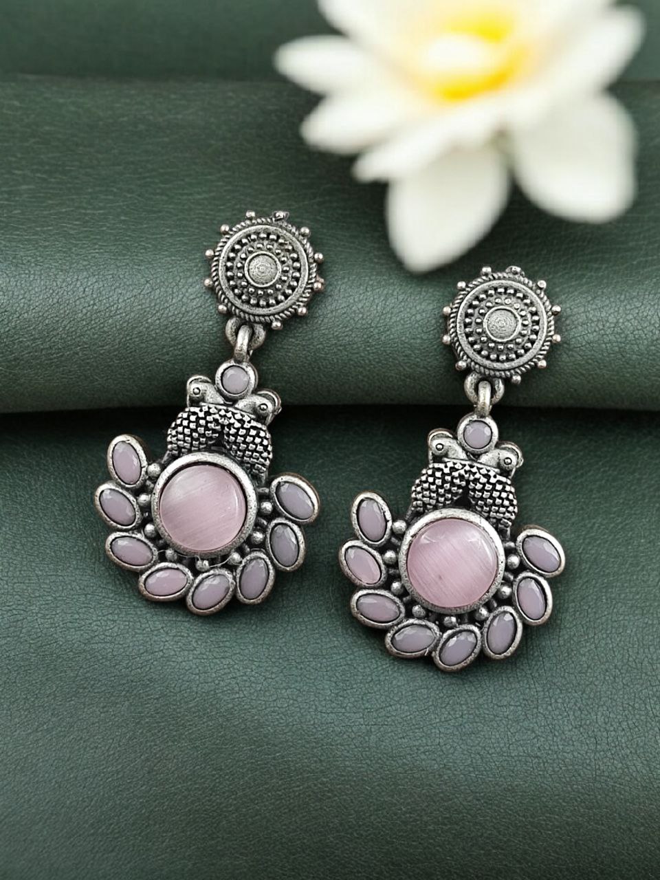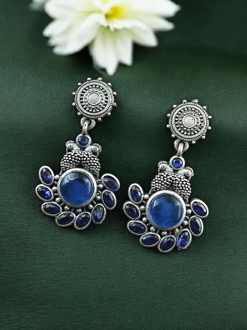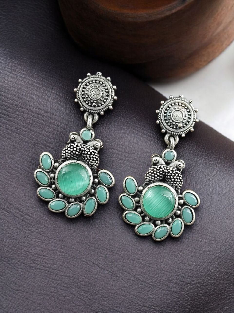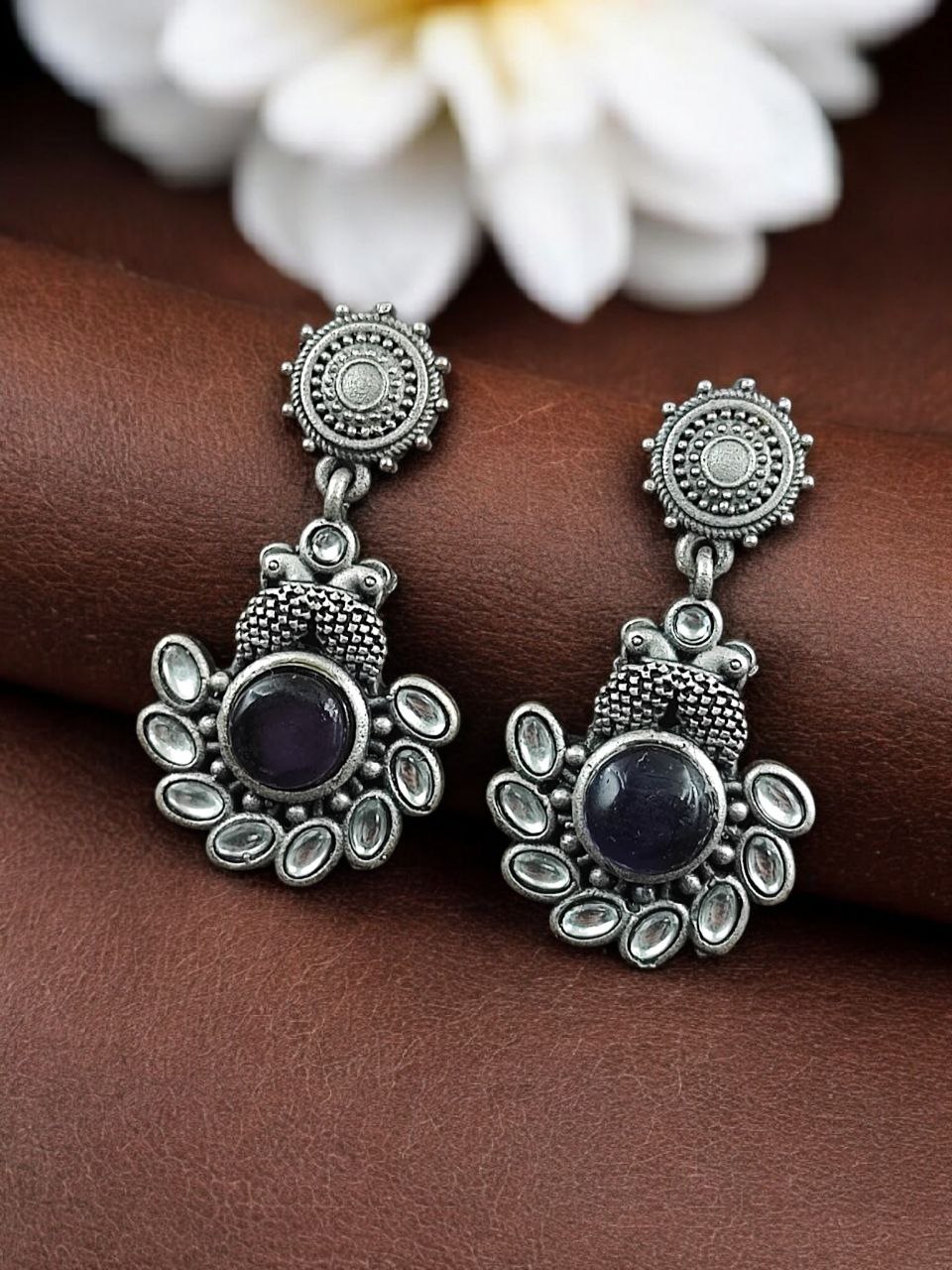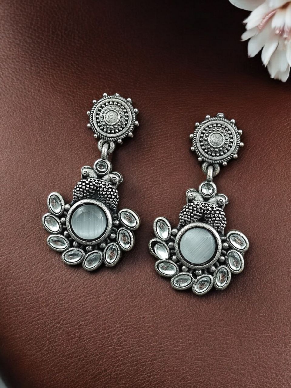 Crafted with a high-quality silver replica finish, these earrings offer the luxurious appearance of silver without compromising on affordability. The intricate detailing of the peacock feathers adds a touch of sophistication, while the polished finish ensures a refined and elegant look. Lightweight and comfortable, these earrings can be worn all day without causing any discomfort, making them ideal for office wear, casual outings, or festive occasions.