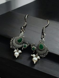 Inspired by the regal beauty of peacocks, these earrings feature an intricately designed peacock motif symbolizing grace, beauty, and pride. The oxidized silver finish lends a vintage touch, making these earrings a standout accessory. The hook-style design ensures ease of wear while adding a chic edge to the overall look.