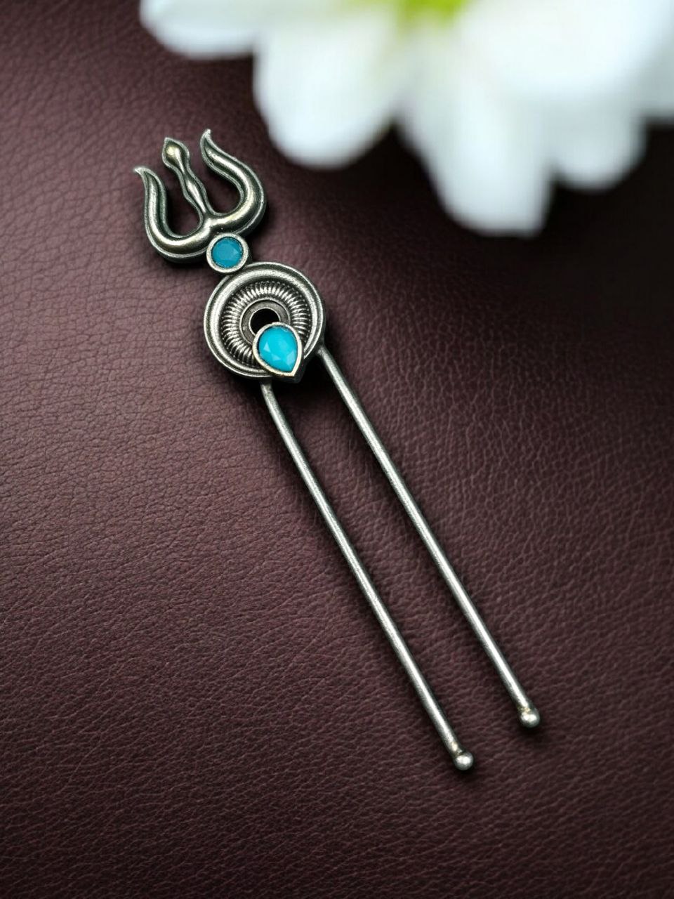 The Silver Trishul Hairpin is a unique and meaningful hair accessory inspired by the sacred Trishul symbol. The Trishul represents power, protection, and spiritual strength in Indian culture, making this hairpin not only a stylish accessory but also a symbol of tradition and belief. Designed with a sleek silver finish and detailed Trishul motif, this hairpin adds a distinctive touch to any hairstyle. Whether worn with traditional outfits or fusion fashion, it enhances your look with elegance and cultural charm.