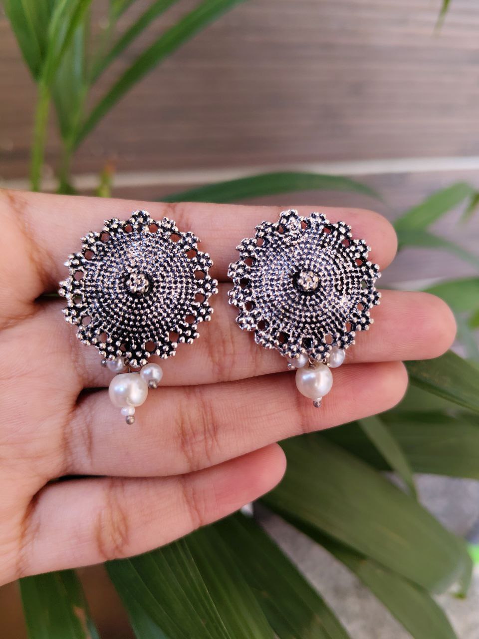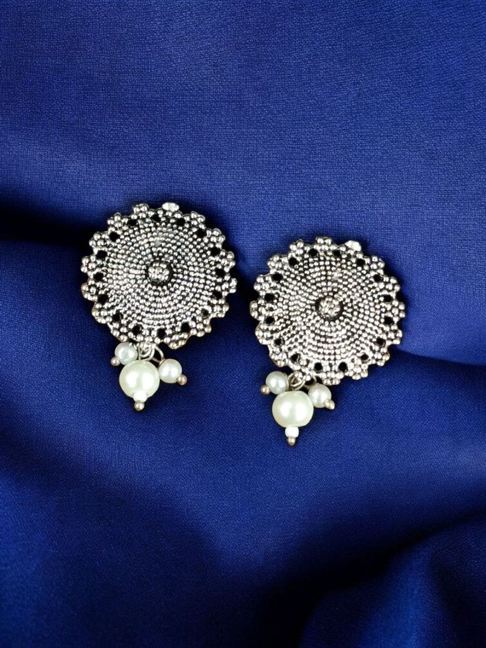 The German silver finish adds a classic vintage touch, making these studs stand out with a subtle shine that never goes unnoticed. The lustrous pearls at the center highlight femininity and grace, making them an ideal choice for women who love jewelry that speaks of tradition while keeping up with modern styling. Lightweight and comfortable, these Stud Earrings are perfect for long wear without causing any discomfort.