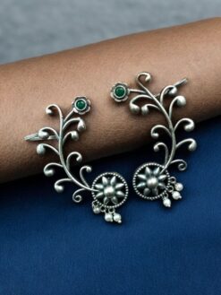 Made from high-quality base metal, this earcuff features a premium silver replica coating with an oxidized-style appeal that gives it a rich antique look. The charming flower design symbolizes beauty and purity, while the delicate stone and pearl detailing adds sparkle and softness to the overall appearance. Each element is carefully placed to create a balanced and eye-catching design that stands out without being too heavy.