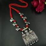 Celebrate timeless tradition with a modern twist through this Peacock Thread Necklace featuring an intricately crafted German Silver pendant. This necklace is the perfect fusion of folk artistry and contemporary aesthetics, making it an ideal accessory for ethnic lovers.