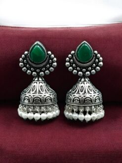 Add these stunning Traditional Monalisa Stone Silver Plated Jhumka Earrings to your collection and embrace the beauty of festive elegance.