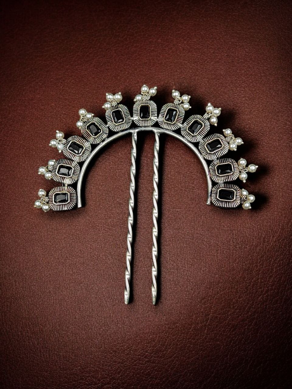 This silver plated hair accessory pairs beautifully with sarees, lehengas, anarkalis, and other ethnic outfits. Its classic design complements both heavy traditional attire and simple festive wear, making it a versatile addition to your hair accessory collection. The pearl and stone detailing enhances its elegance, making it suitable for special occasions and celebrations.