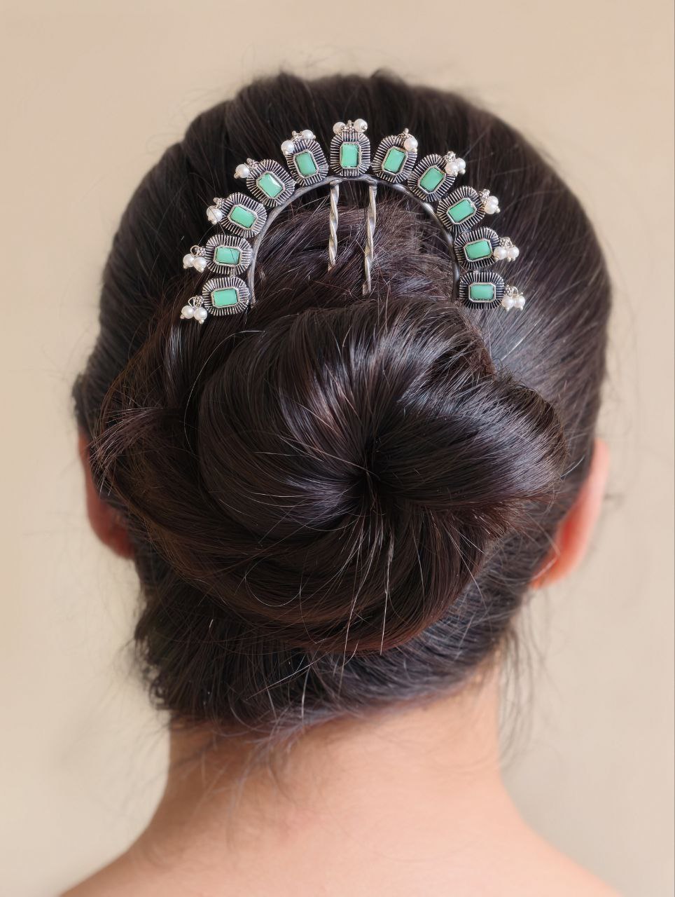 Add a touch of traditional elegance to your hairstyle with the Traditional Silver Plated Square Shape Juda Pin, beautifully adorned with pearl and stone work. Designed to enhance classic Indian hairstyles, this handcrafted hair accessory reflects rich cultural artistry while offering a refined and graceful look for modern women.