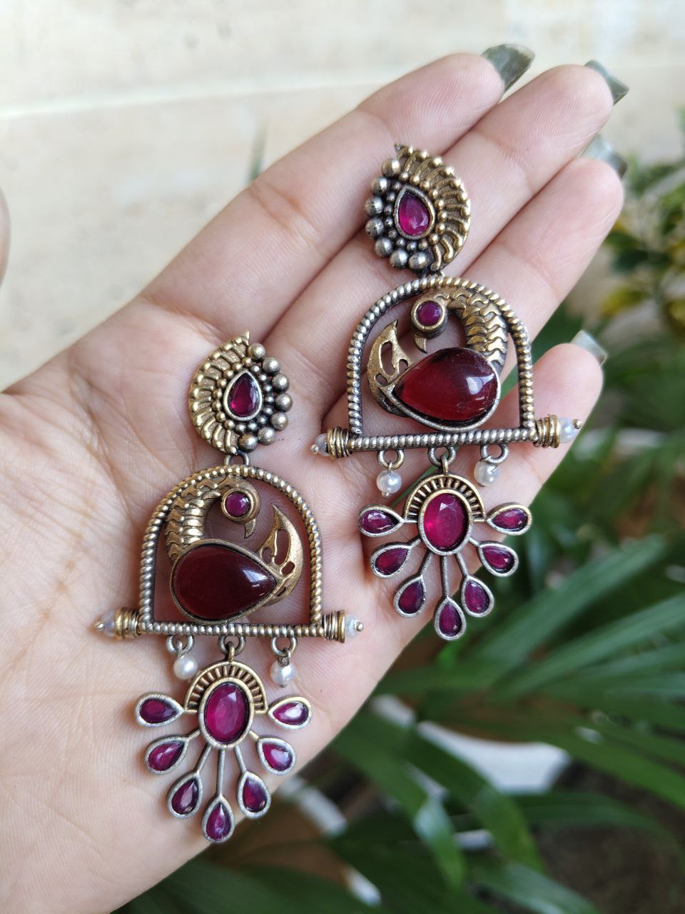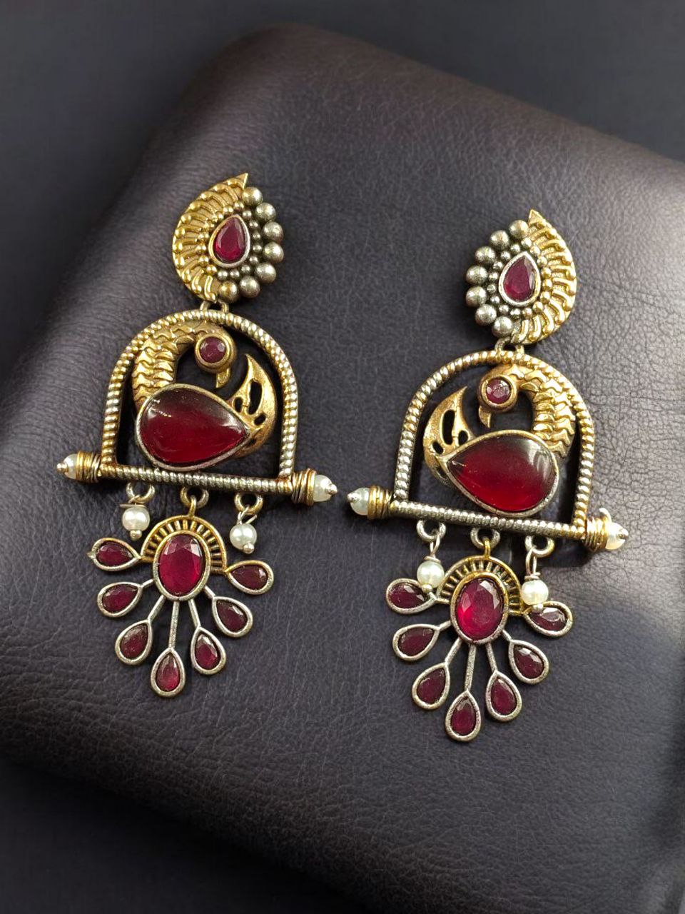 Handmade with precision, the earrings feature a stunning combination of antique gold tones with shimmering silver touches, highlighted by rich red stones and delicate pearl embellishments. The intricate design showcases a regal peacock-inspired motif, symbolizing beauty, pride, and sophistication. The balance of pearls and stones adds a luxurious appeal while maintaining an ethnic authenticity that resonates with traditional Indian jewelry.