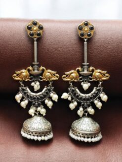 If you are searching for jewelry that blends artistic design, elegant detailing, and versatile styling, these Designer Two-Tone Bird Jhumka Earrings with Pearl & Stone Work are the perfect choice. Let your style reflect elegance, tradition, and confidence with this beautifully crafted pair.Brand