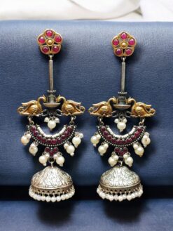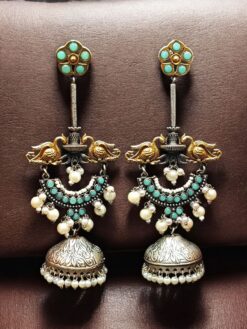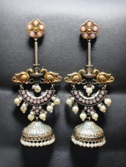 two tone jhumka earrings, bird design jhumka earrings, pearl stone jhumka earrings, designer jhumka for women, ethnic jhumka earrings, party wear jhumka earrings, traditional pearl jhumka, stone work jhumka earrings, festive wear earrings, Indian designer jhumka are thoughtfully designed to feel lightweight on the ears.
