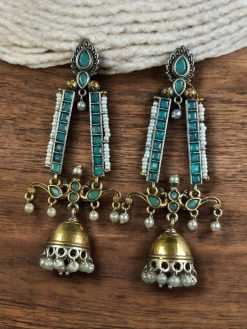 Crafted with premium-quality materials, these Two-Tone Jhumki Earrings are lightweight and comfortable to wear for extended hours. The stone work sparkles beautifully under light, making them an eye-catching accessory, while the pearl beads add movement and elegance with every step you take. Their long dangler structure gives your look a graceful elongation, enhancing both ethnic and fusion outfits.