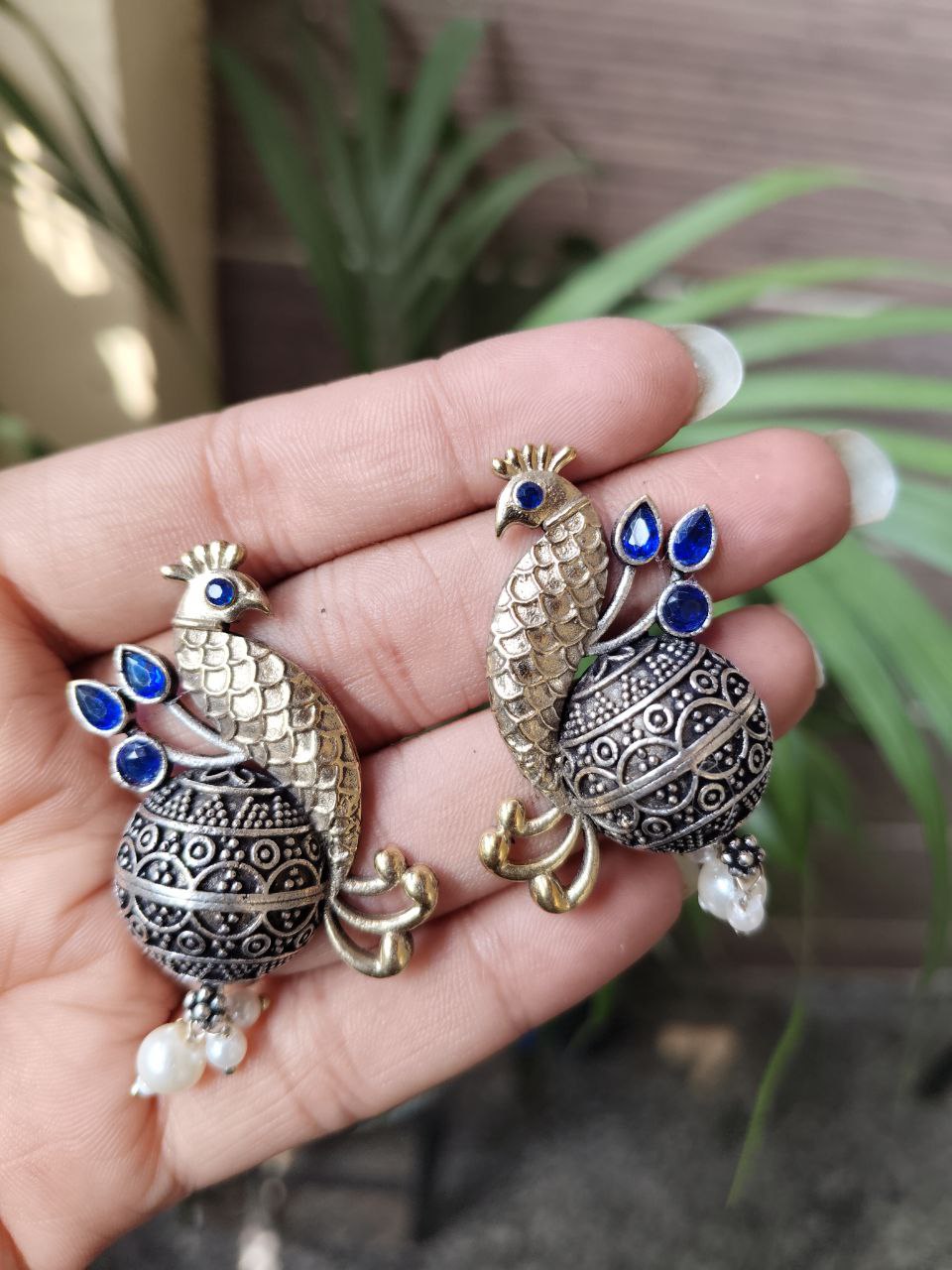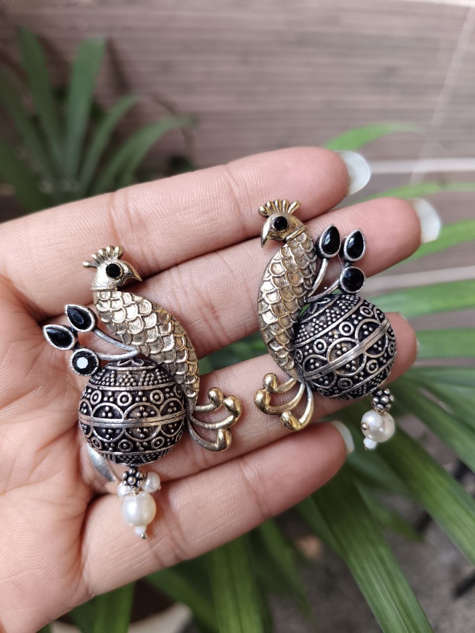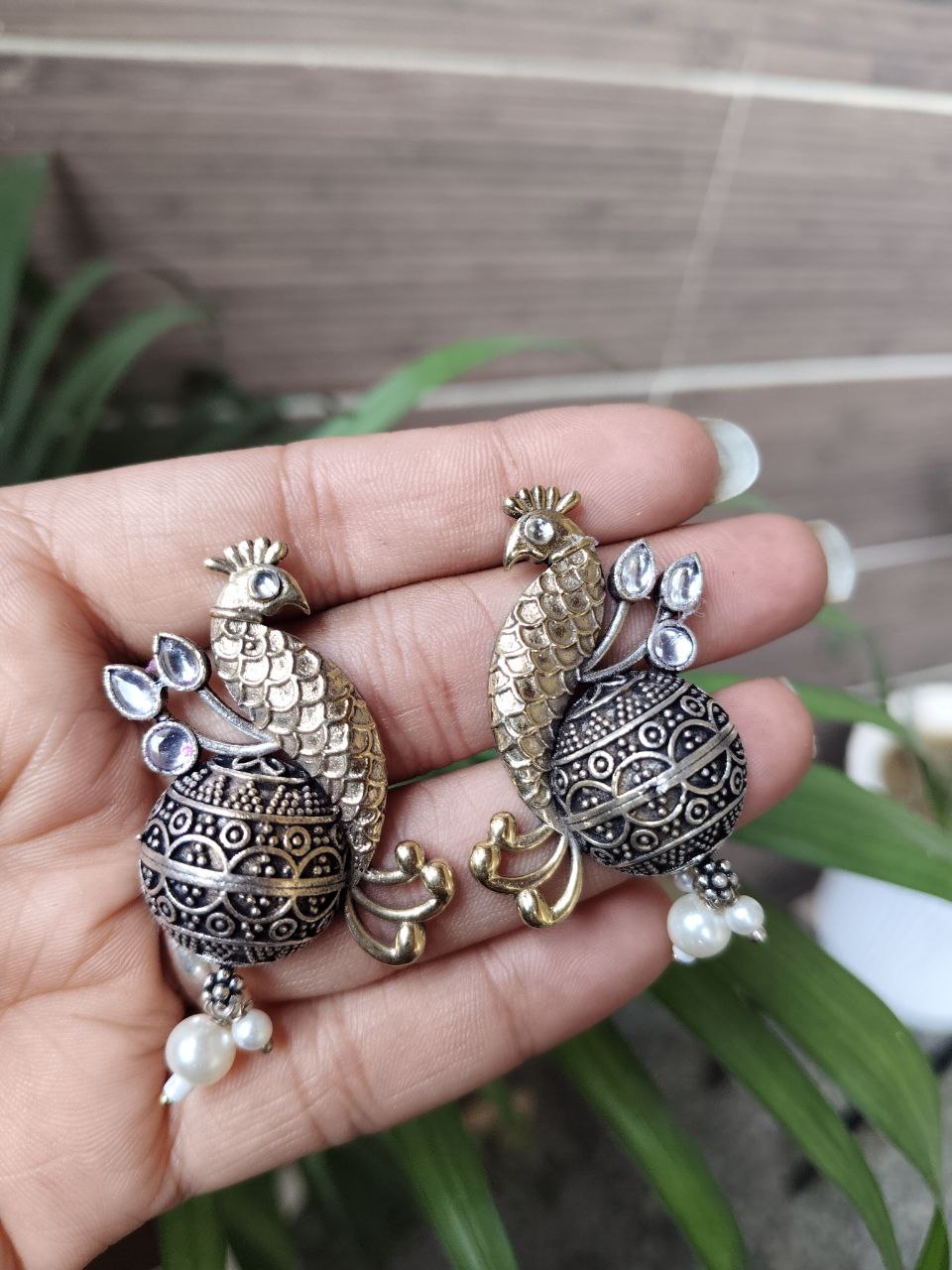 Made from high-quality brass, these earrings are designed to ensure durability while maintaining a lightweight feel for all-day comfort. The intricate peacock detailing reflects fine craftsmanship, while the dual-tone polish adds depth and elegance to the overall design. This combination makes the earrings visually appealing and suitable for various occasions.
