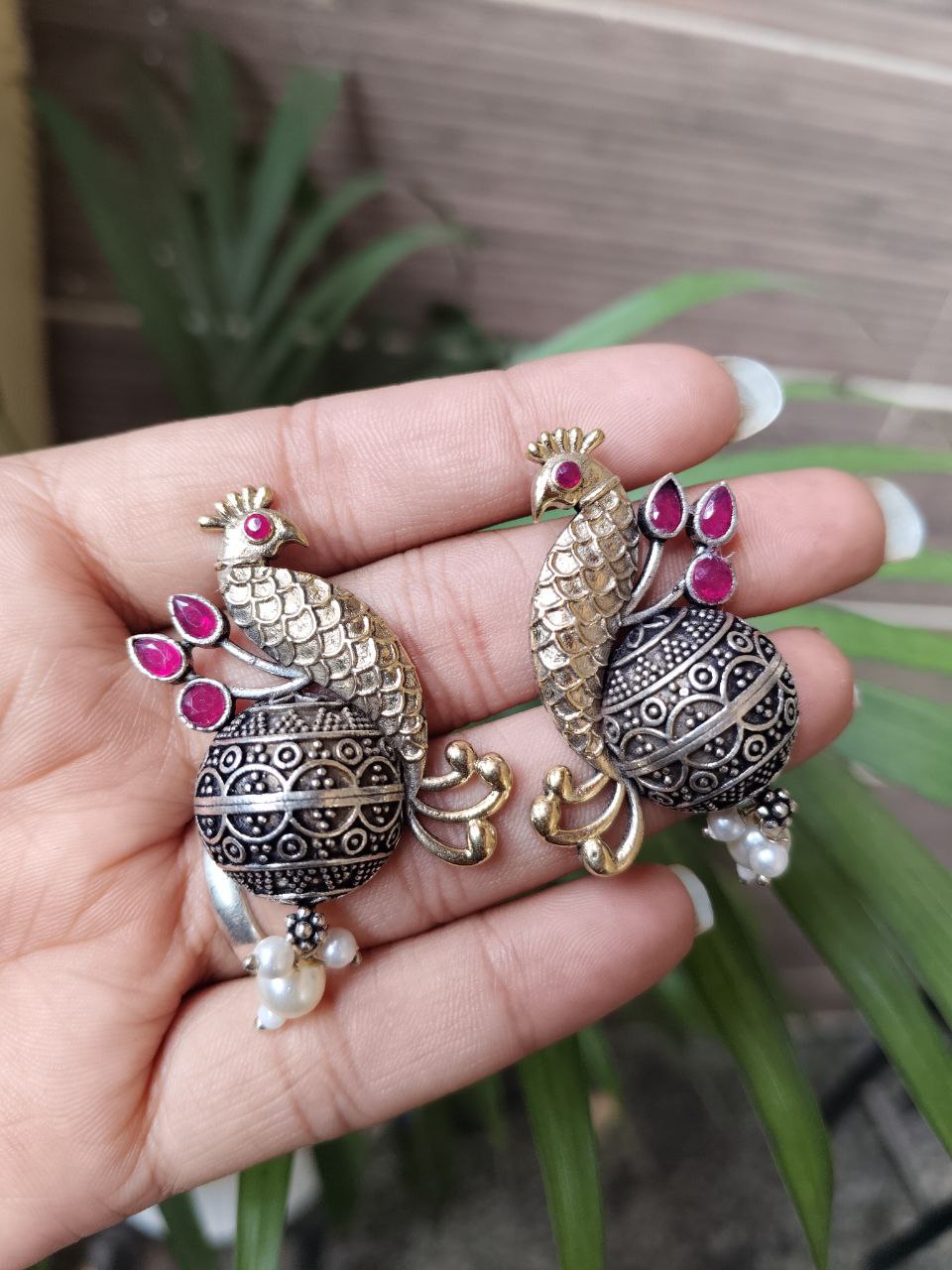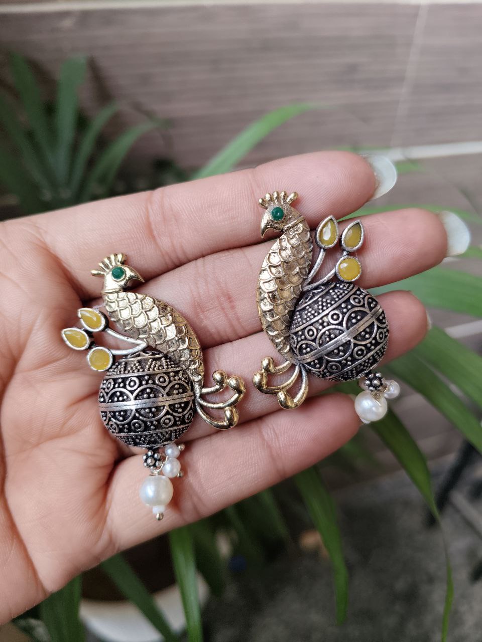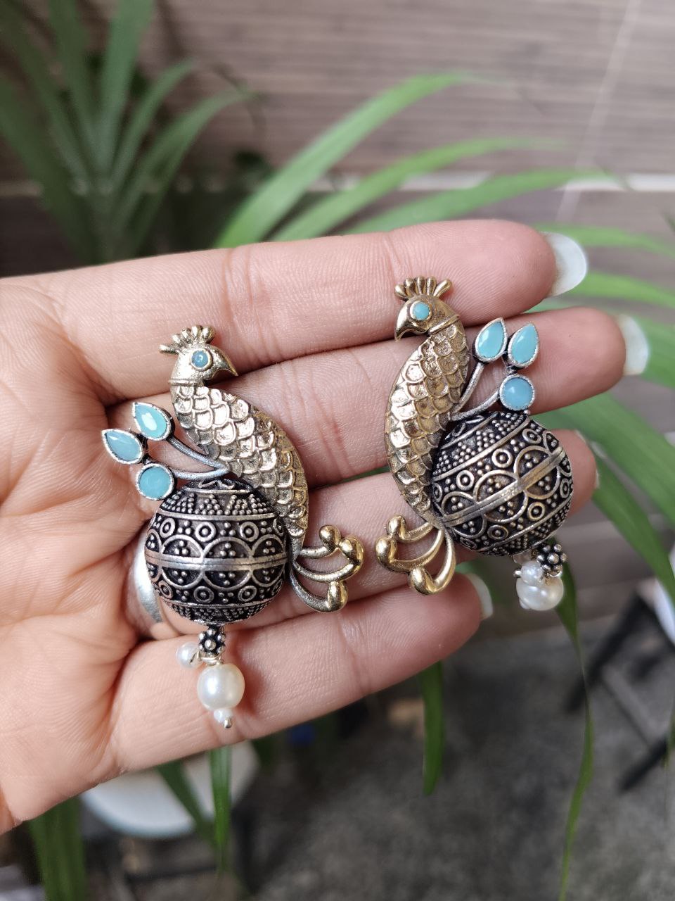 Made from high-quality brass, these earrings are designed to ensure durability while maintaining a lightweight feel for all-day comfort. The intricate peacock detailing reflects fine craftsmanship, while the dual-tone polish adds depth and elegance to the overall design. This combination makes the earrings visually appealing and suitable for various occasions.