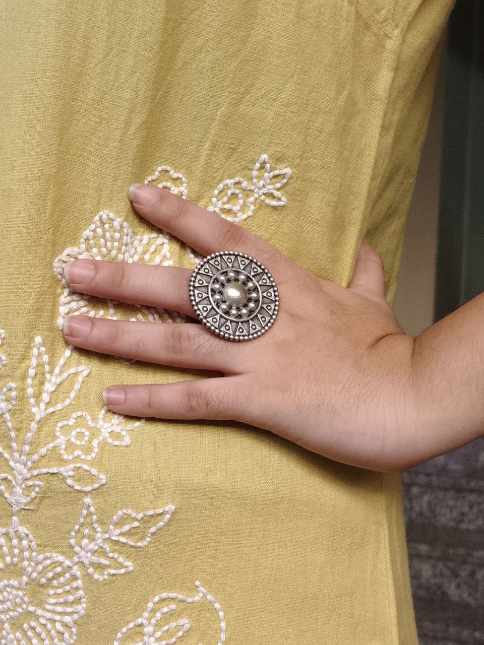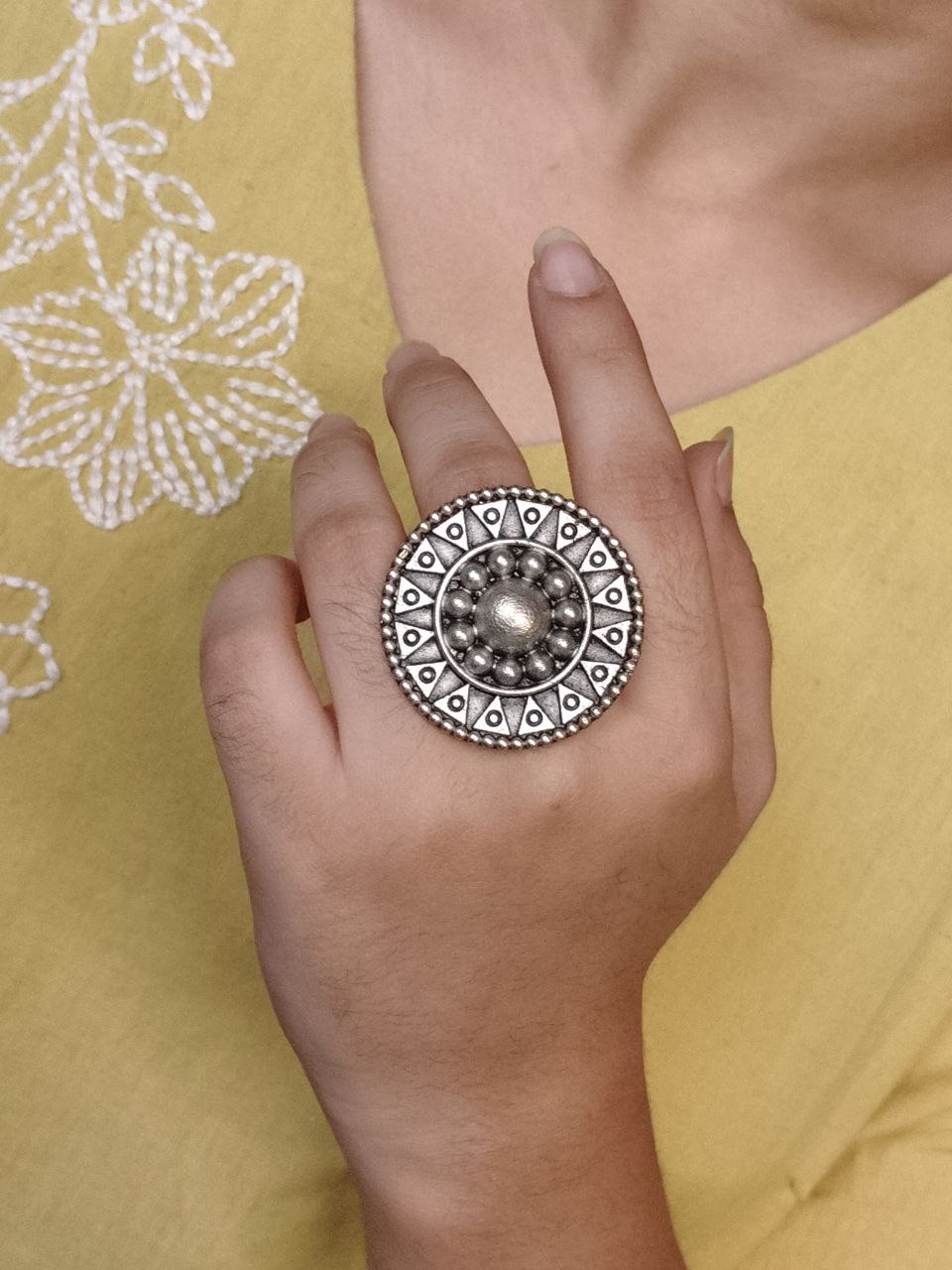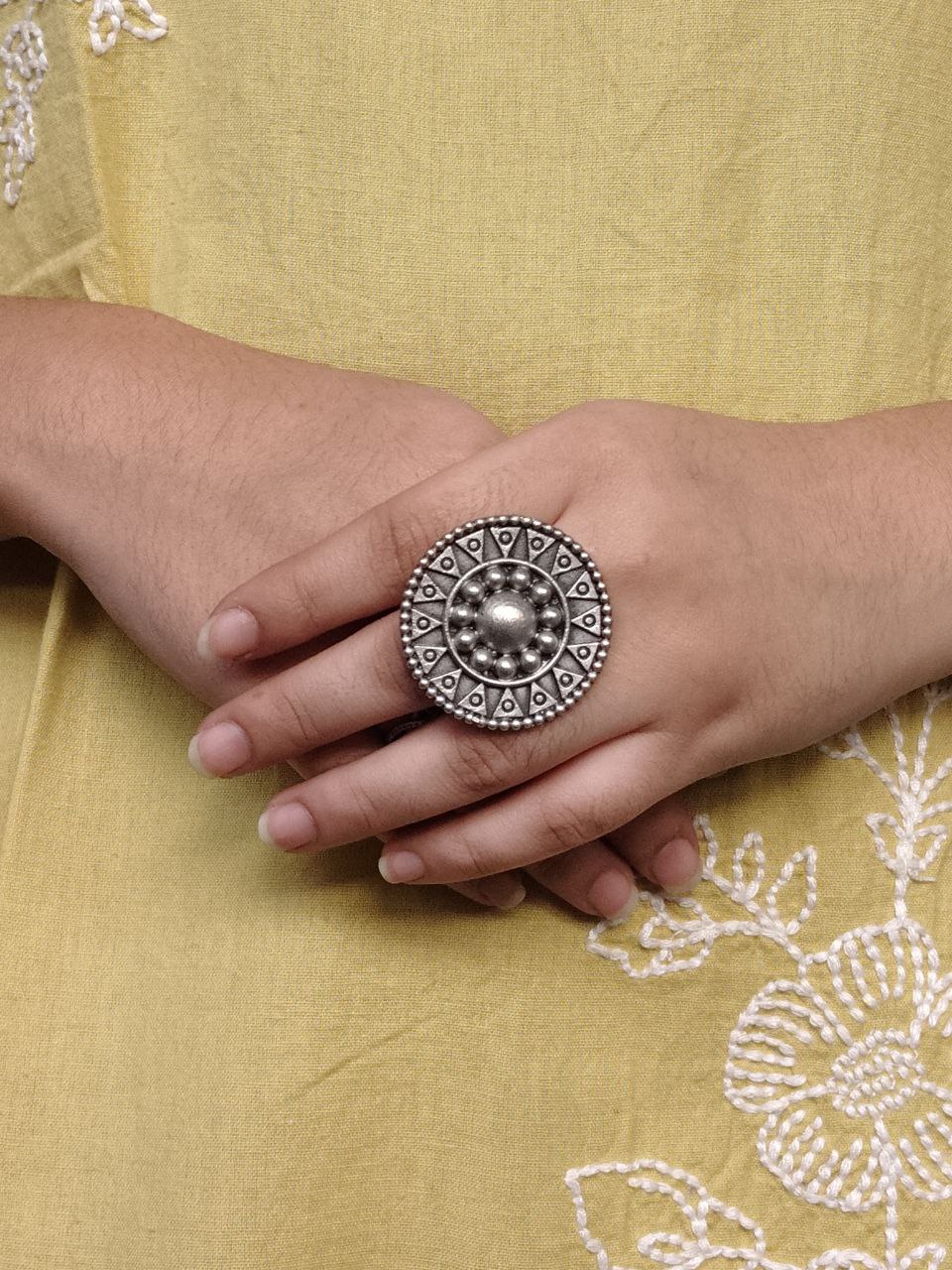 Each piece is carefully handcrafted by skilled artisans known for their expertise in oxidized jewelry. The intricate patterns and fine carvings reflect traditional Indian craftsmanship, making this Unique Design Ring not just an accessory but a piece of art. It pairs beautifully with sarees, lehengas, kurtis, western outfits, and fusion wear—its versatility is truly unmatched.