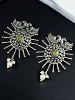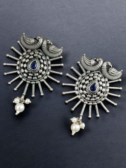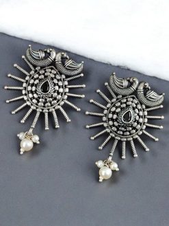 Pair these earrings with a simple outfit to let them shine or combine them with other pieces from our collection to create a personalized look that reflects your individuality. Their versatility makes them suitable for all occasions, from everyday wear to special events. Invest in a piece of artisanal craftsmanship and make a style statement with our designer iconic look Oxidised Earrings. Embrace the beauty of tradition reinvented for the modern world and experience the joy of wearing jewelry that tells a story. Order now to add a touch of elegance and sophistication to your jewelry collection. Treat yourself or someone special to a pair of earrings that will become a treasured favorite. Discover the allure of unique design and impeccable craftsmanship with our exclusive oxidized dangler hook earrings.