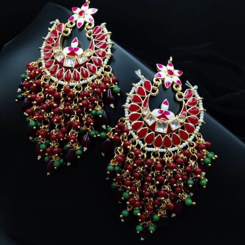 Crafted with meticulous attention to detail, these earrings feature Kundan and Meenakari work in a stunning combination. The Kundan stones in vibrant hues create a mesmerizing play of colors, while the Meenakari work adds intricate detailing and a touch of regal charm.