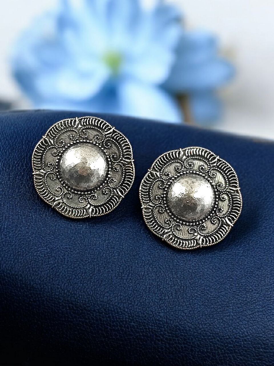 Made from high-quality base metal, these Oxidized Stud Earrings feature a premium oxidized silver replica coating that gives them a rich antique appearance. The vintage look is enhanced with subtle traditional patterns, making them an ideal choice for daily ethnic wear as well as special occasions. Their refined detailing showcases skilled craftsmanship while maintaining a simple and elegant silhouette.